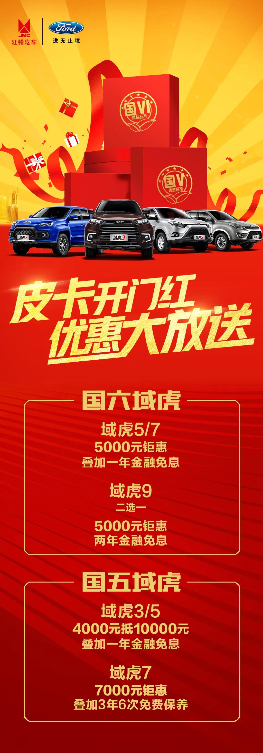 2月12日-3月31日,江鈴汽車(chē)針對旗下明星皮卡品牌——域虎家族,推出購域虎3 域虎5可享受專(zhuān)屬定制優(yōu)惠方案的優(yōu)惠活動(dòng),購車(chē)補貼高達6000元。